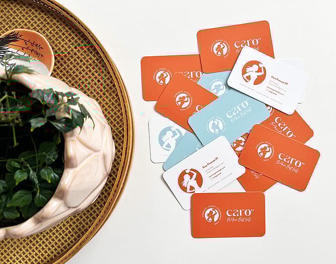 Once the branding was established, I extended Caro’s logo and visual identity across her brand materials to keep everything consistent and recognisable. This included designing her business cards and adapting the branding for merchandise such as T-shirts and hats, helping create a cohesive look both in person and across her growing fitness community.